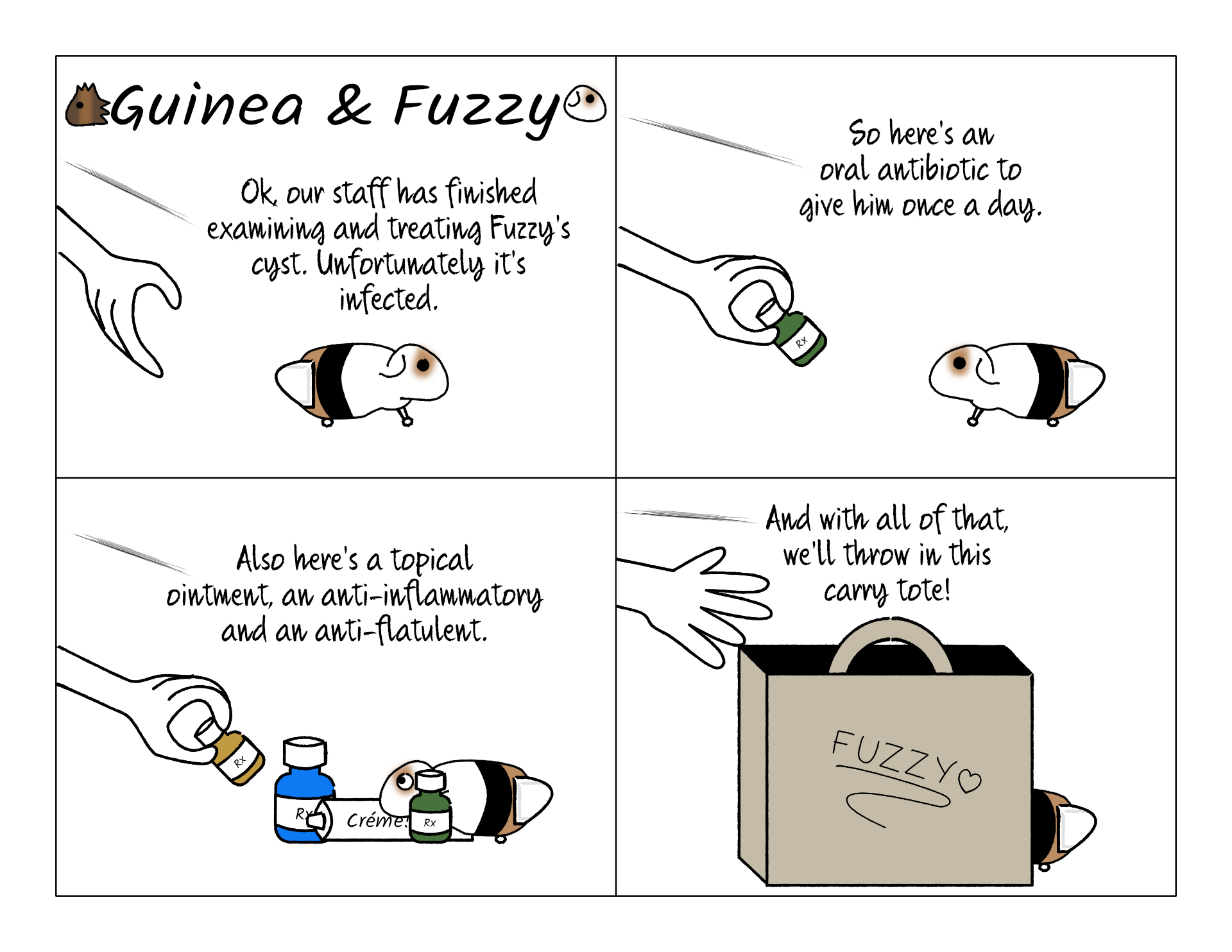 Poor Fuzzy. As I mentioned, his bump was bleeding, so at first the vet thought he had an infected sebaceous cyst. She gave him all of these meds. The anti flatulent is to counteract the side effect of the anti inflammatory. Otherwise it could be kind of bad for a pig who already has blockage problems.