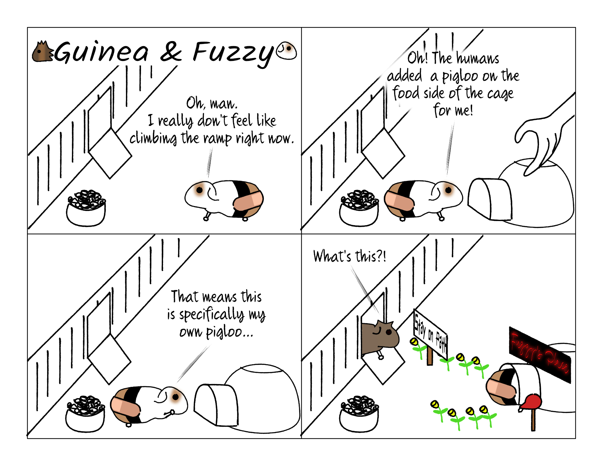 Fuzzy never likes to cross the ramp. But we make him do it anyway, because at least it's a little exercise for him. The food is on one side and the pigloos on the other. Which works, he crosses regularly.