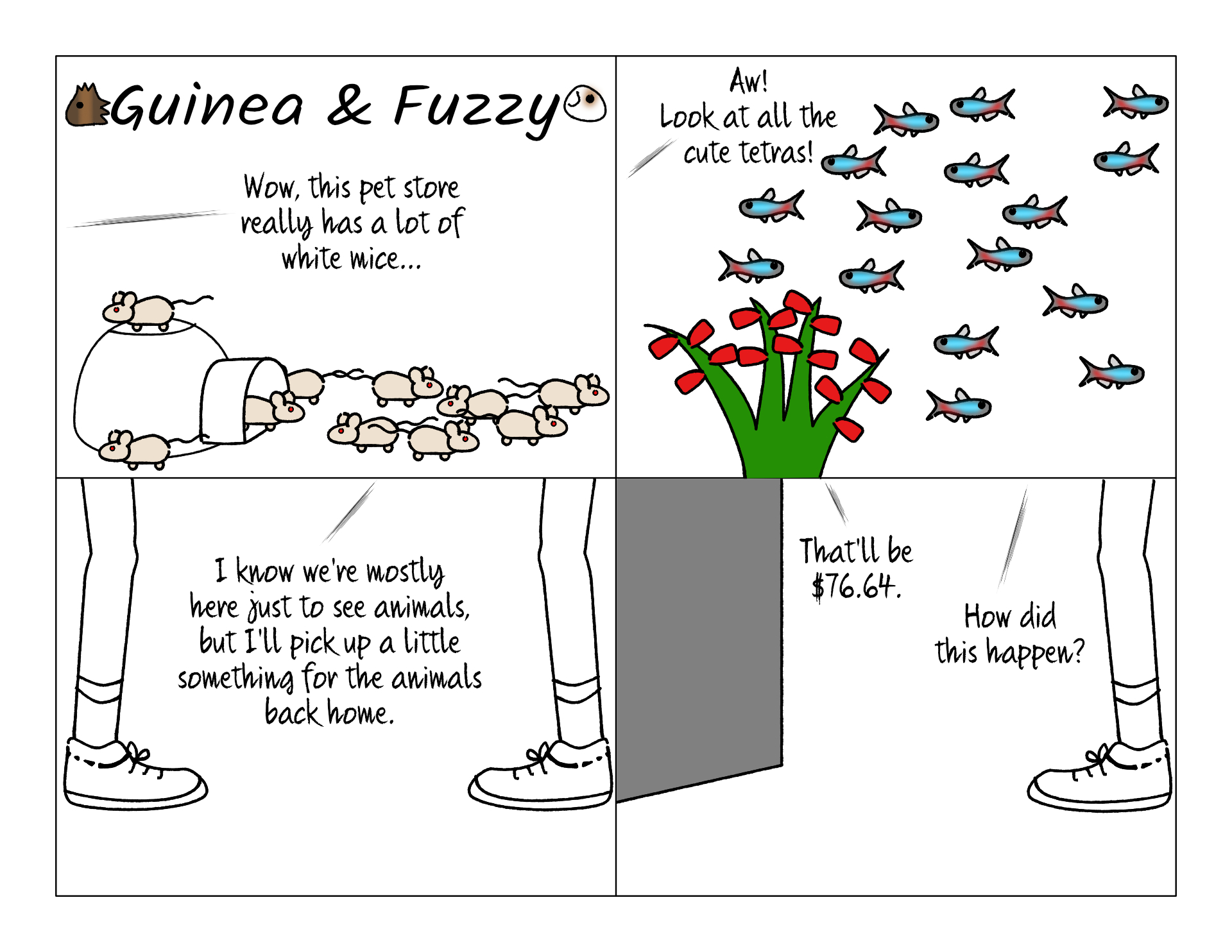 I don't know why but the local pet store keeps all of their white mice together in one small cage, so there's a huge pile of them. They also usually have a ton of tetras, because they are the most popular type of aquarium fish. Except when we were actually in the market to buy more, then they kept selling out. In addition to regular supplies, a big chunk of the money we spent went to a new fish tank decoration that will feature in a future comic.