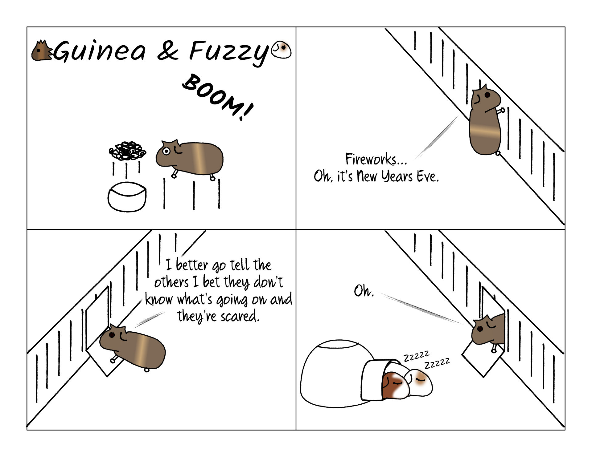 I've heard stories about guinea pigs being super scared of fireworks. Their owners have to hide them away somewhere on New Years Eve so that they're not terrified all night. Our piggies don't really care much.