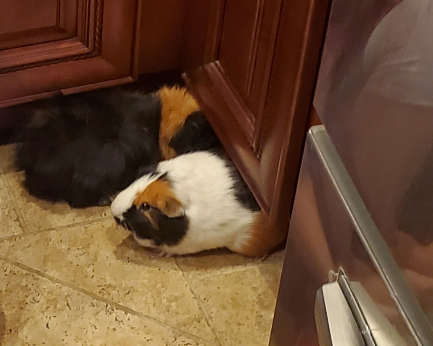 Here are Guinea and Fuzzy on another one of their adventures. This time they are exploring the kitchen together. Guinea discovered hiding under the cabinets. And this might be when they conceived of the fridge heist. Fuzzy was always bolder than Guinea when exploring, but as long as Fuzzy was there to protect him, Guinea was happy to follow.