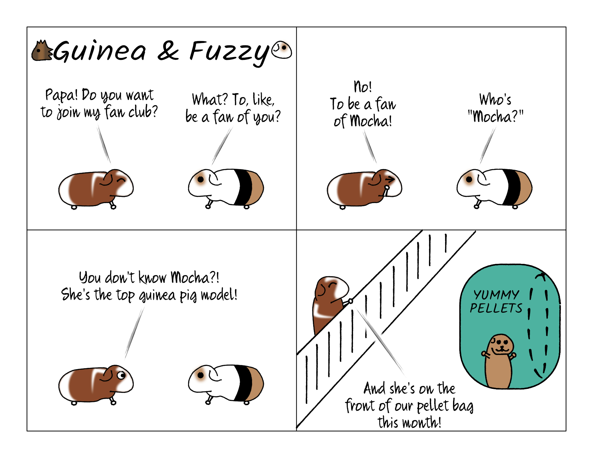 There is always a guinea pig standing in a farm on the front of the bag of guinea pig pellets. And interestingly, the guinea pig changes once in a while, although I'm not sure it's once a month. But it's always the same pose and the same farm. I can't imagine what the audition and selection process is for this bag model. I wonder if they're anyone's pets.