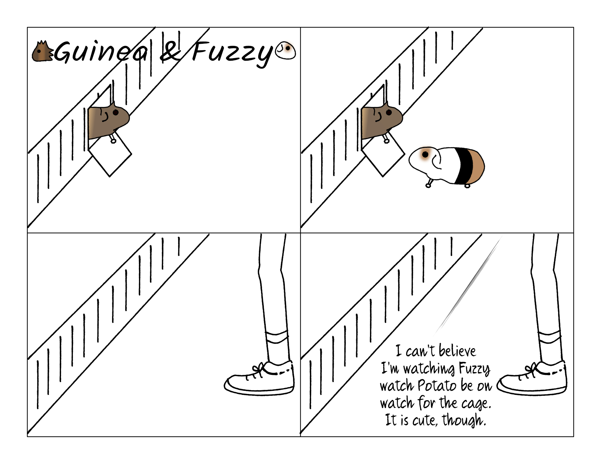 It's cute watching Potato guard the cage, because he has to curl up into a little ball to balance on top of the ramp, and stick his head up in the air to see as far as possible. You can tell, even Fuzzy thought so because he would stare at Potato while he was guarding sometimes.