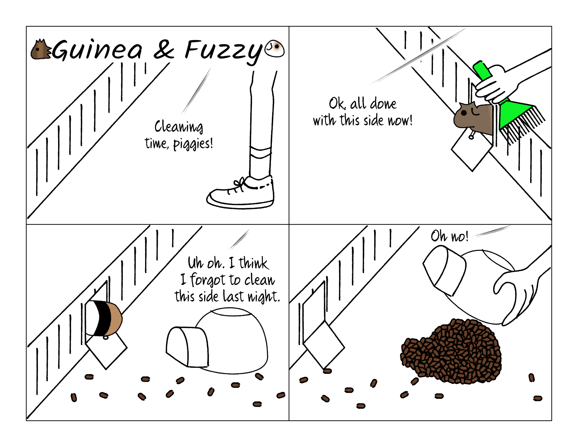 Keeping the cage clean is a daily job. Once per day I sweep out all of the "debris" off of the bedding blankets, and refill the hay, water bottles, and pellets. Twice per week I shake off the blankets and launder them, cycling through three sets because it takes three days for them to air-dry, since they're so absorbent. Once every couple of months I have to take everything out of the cage and scrub it down because grime builds up on the pigloos and food bowls. Once per year I buy a new cage liner, and a new pair of blankets, throwing away the oldest pair that no longer gets completely clean in the wash.