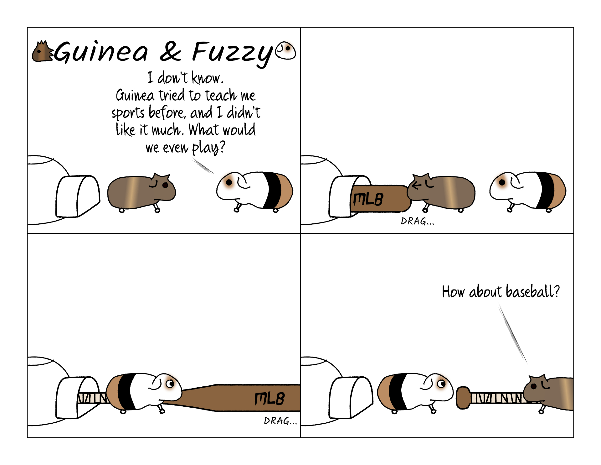 Potato made a mistake. Guinea actually got Fuzzy to try sports, briefly, because he managed to get pig sized equipment.