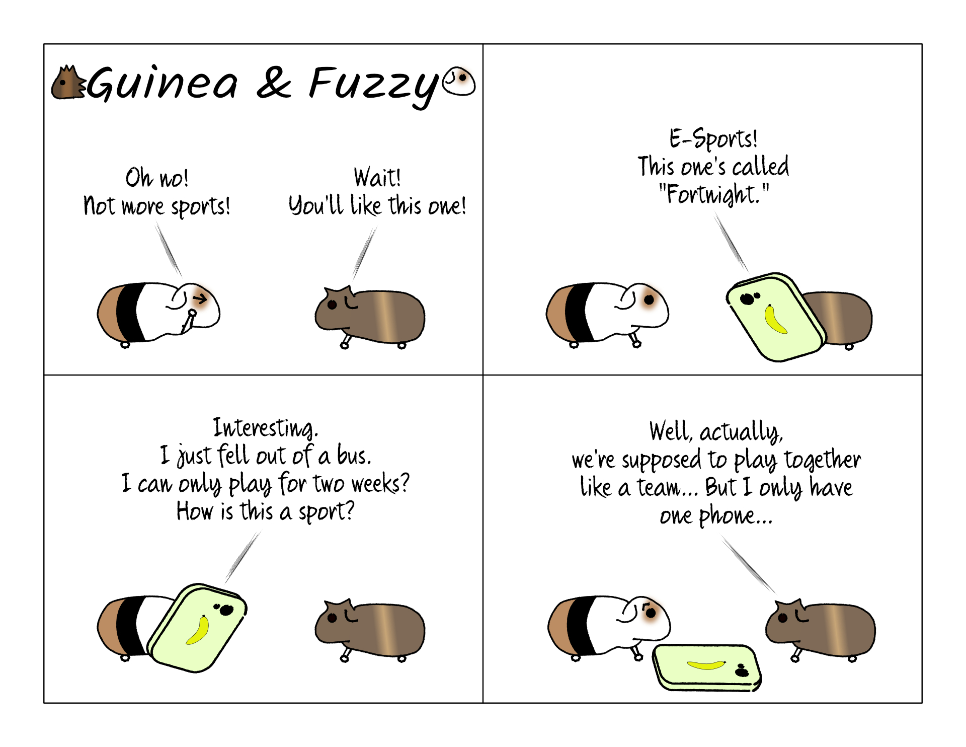 Finally this might be a sport that's just right for Fuzzy. In terms of physical activity at least. But it's not perfect. Fortnite might be the only one where he could compete on Potato's old phone, but it's probably still not sufficient hardware to play professionally.