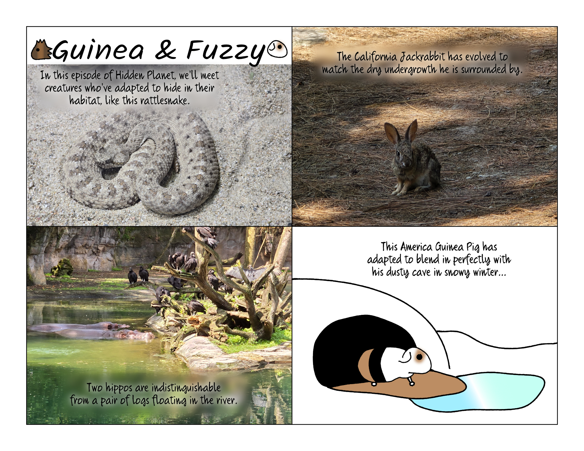 I was wondering what Fuzzy's fashionable coat evolved for. This is clearly the explanation. What other environment is white, black, brown? Potato blends in well with a forest floor with pools of sunlight on it. And Bean blends in with milk chocolate marshmallow swirl...