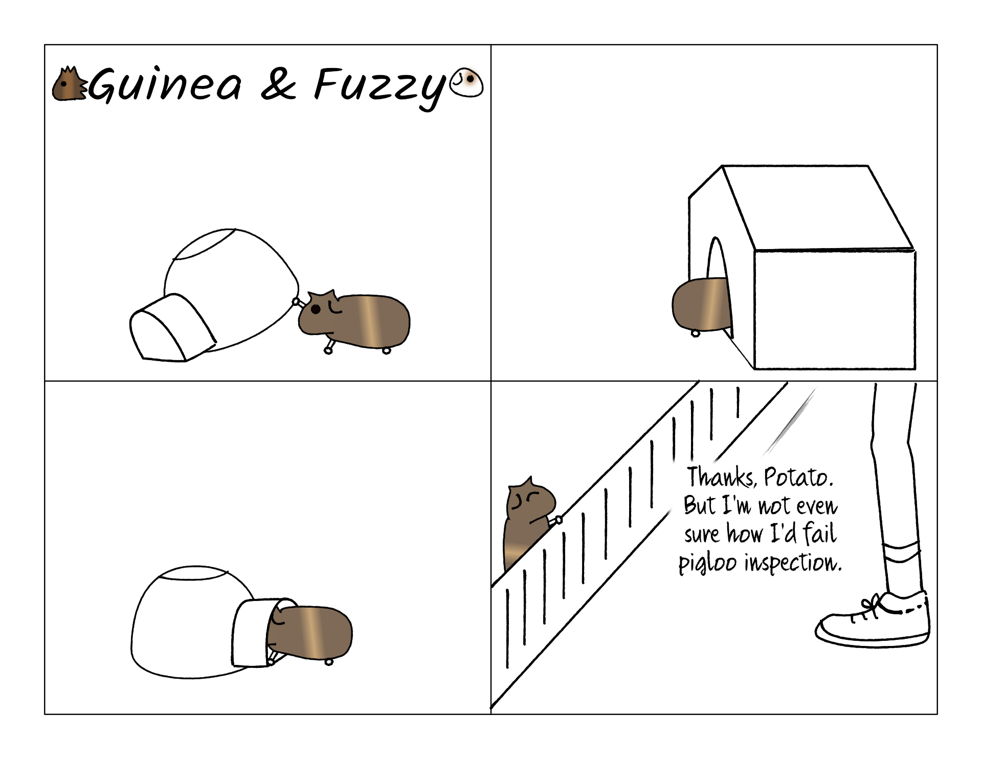 Not only does Potato always inspect the food side of the cage when I change it, he also inspects the sleeping side. He deliberately runs into each pigloo right after I put each one down and examines the inside. Then he verifies there aren't any he missed and he goes back to the front to wait for dinner.