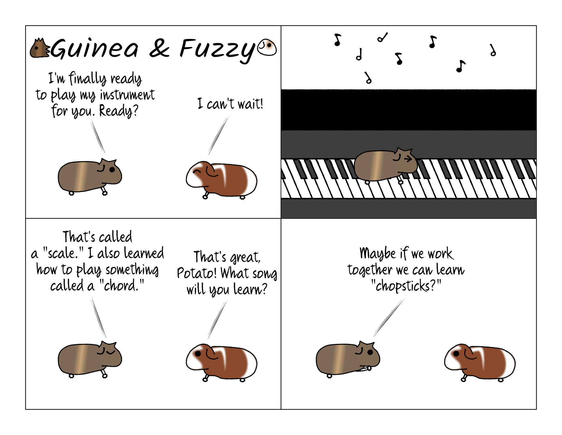 Guinea pigs are perfectly suited to play piano. They can easily walk across the keys and play all kinds of stuff. We haven't let Potato actually try it, though. I wonder if the sounds were surprise him or he'd get the hang of it.