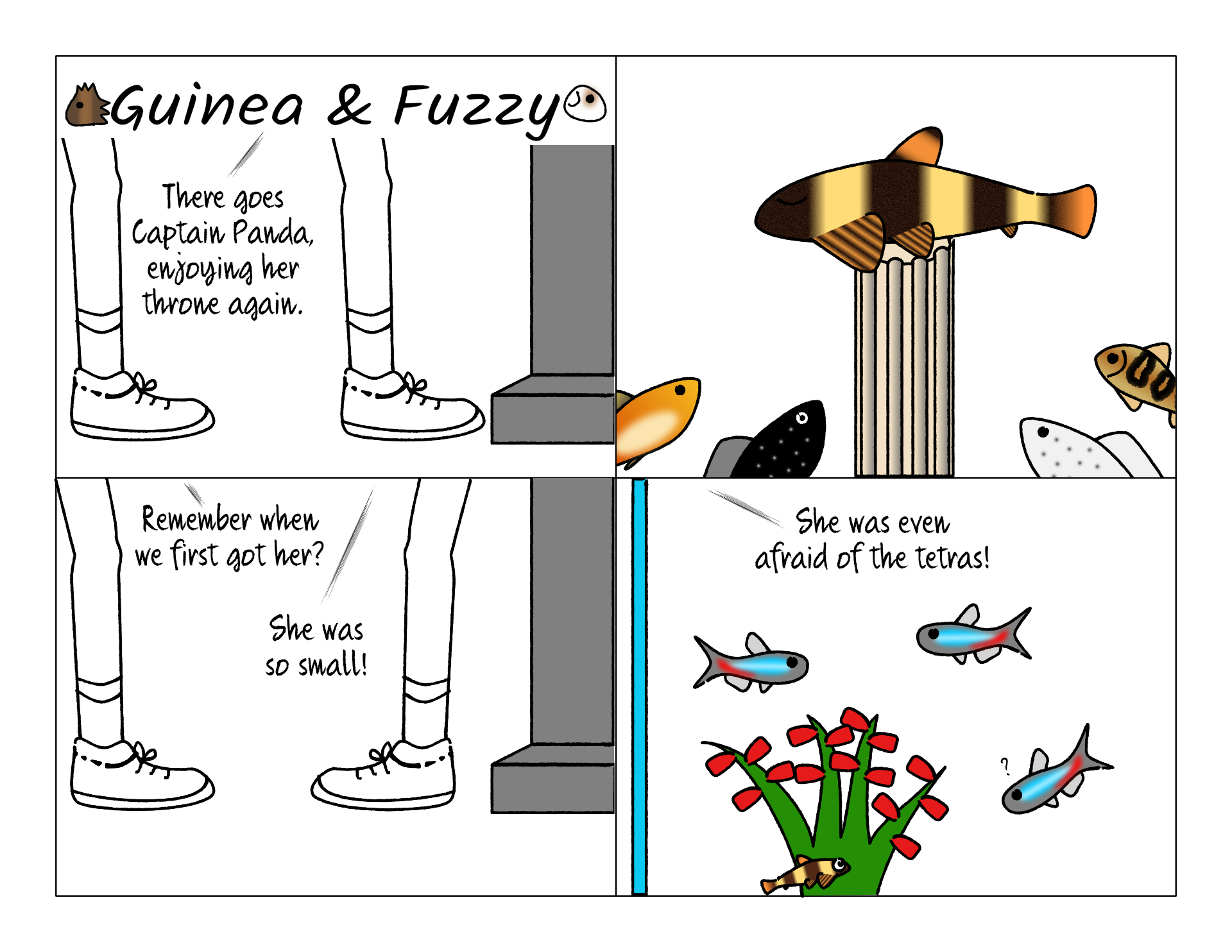 I actually don't remember this. But I was looking at old photos and found one of tiny Captain Panda hiding from some big scary tetras. She was probably less than half an inch!