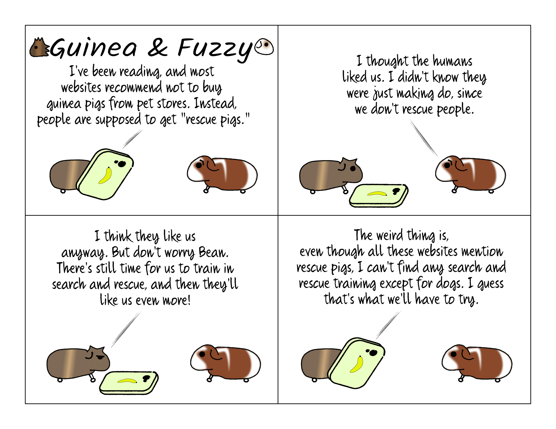 When we first got Guinea and Fuzzy, we did not know about guinea pig rescues. By they time we got Potato and Coco Bean, we did. But it was when things were still recovering from Covid, and the only rescue we could find was more than two hours drive from our house. That didn't seem feasible. So they joined us from the local PetCo.