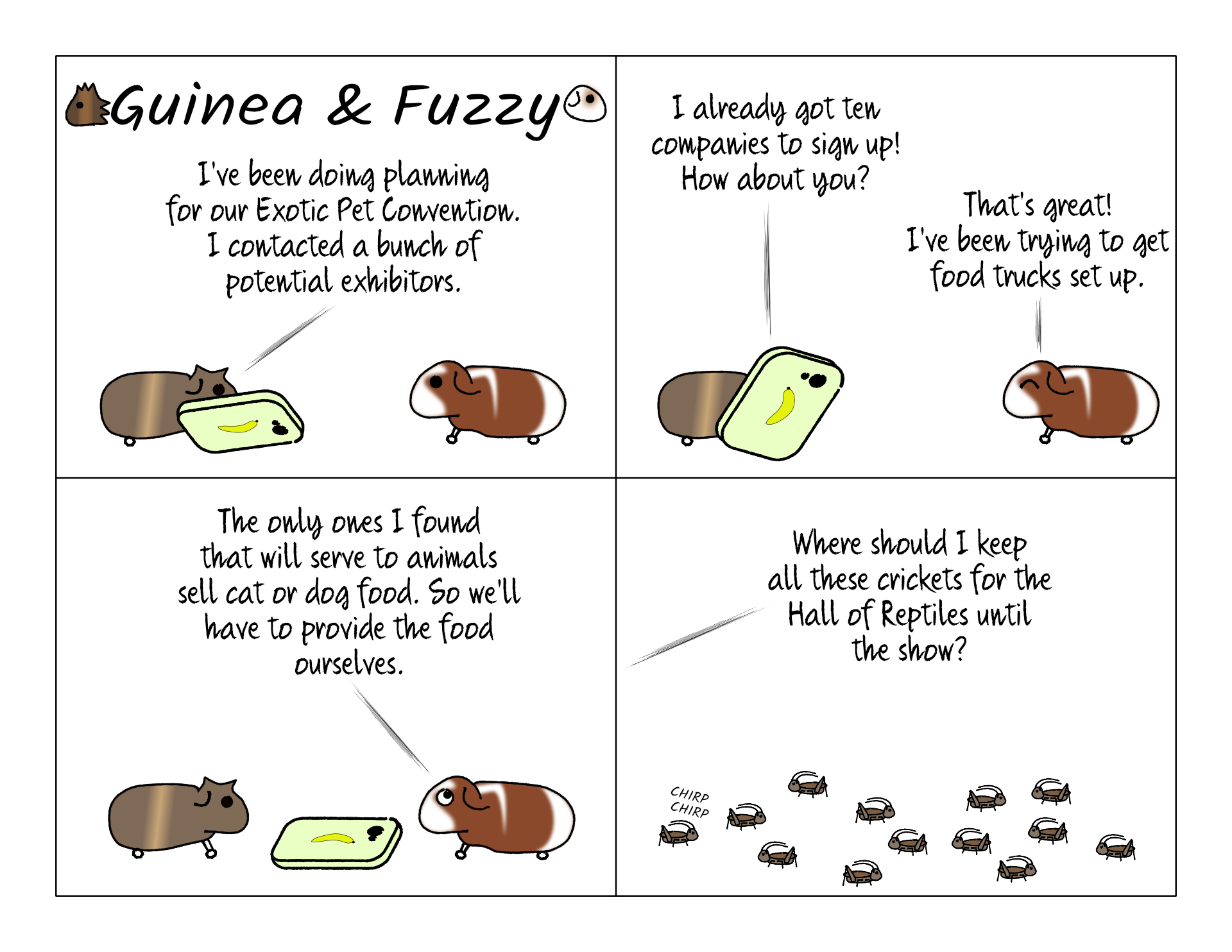 Good thing Bean is being open minded about food options at the convention. But I wonder what he's going to do for the snakes. He can't get mice, considering some of the guests might be mice! I guess snakes don't have to eat that often, so he can just skip their food venues.