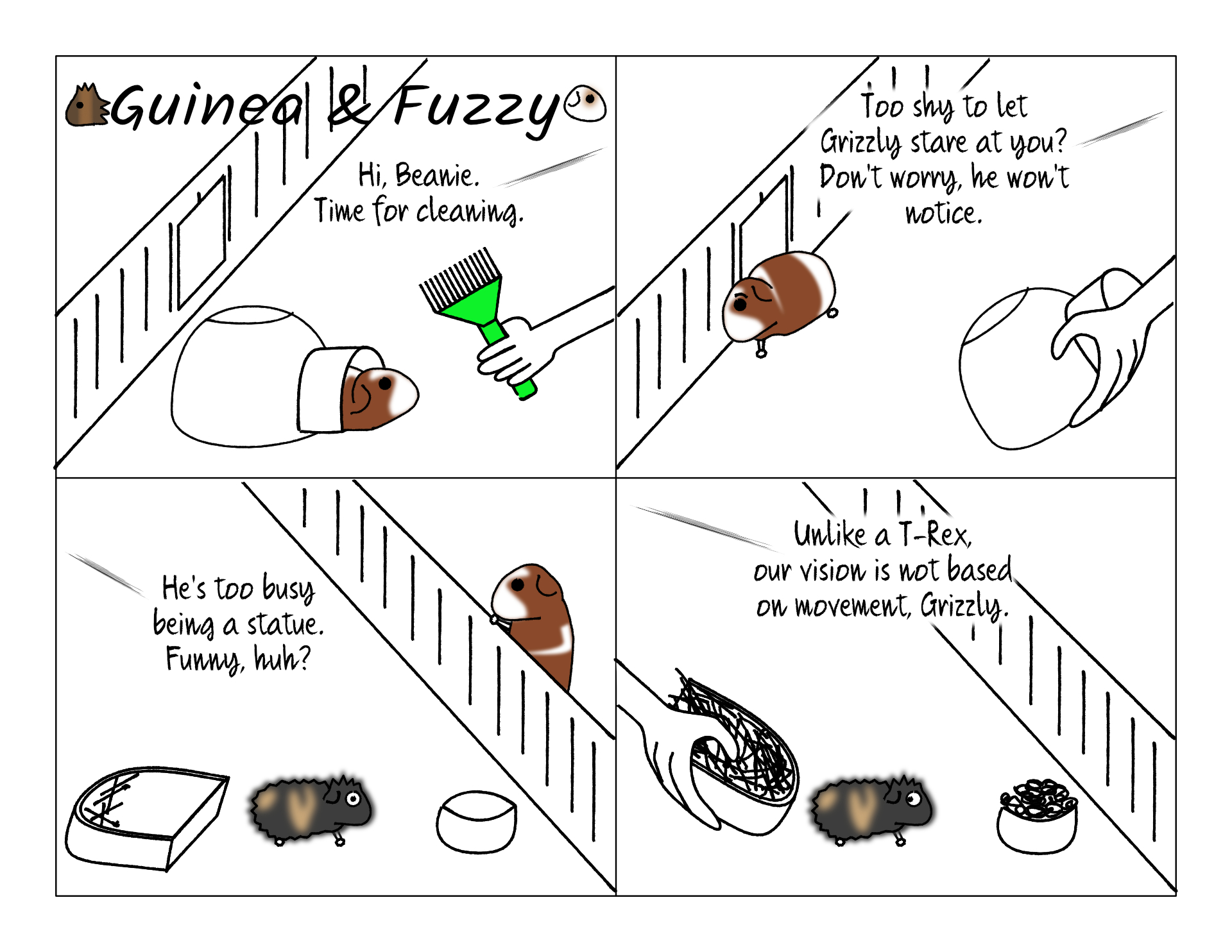 We had seen this in a petting zoo before, so we knew this was a thing that guinea pigs might do. But I was surprised to see Grizzly doing it for his first cage cleaning. Without a place to hide he would just freeze solid. Not lying down or in the corner, just standing up straight and still and wouldn't even move if I touched him. He learned really quickly that doesn't work, so he doesn't do it anymore.