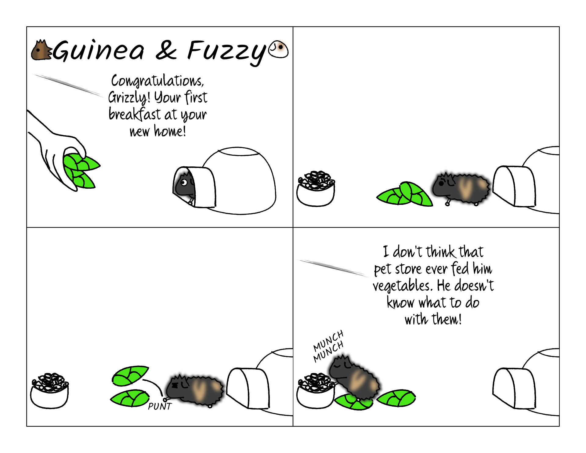 It's hard to believe, but I think Grizzly really was raised on just pellets and hay until we got him. The first time we fed him romaine, he didn't know what to do with it. Eventually, the next day, he tried a few bites and discovered it was food. But every time I fed him a new food, especially if it was a new color like carrot or radicchio, he would be confused.