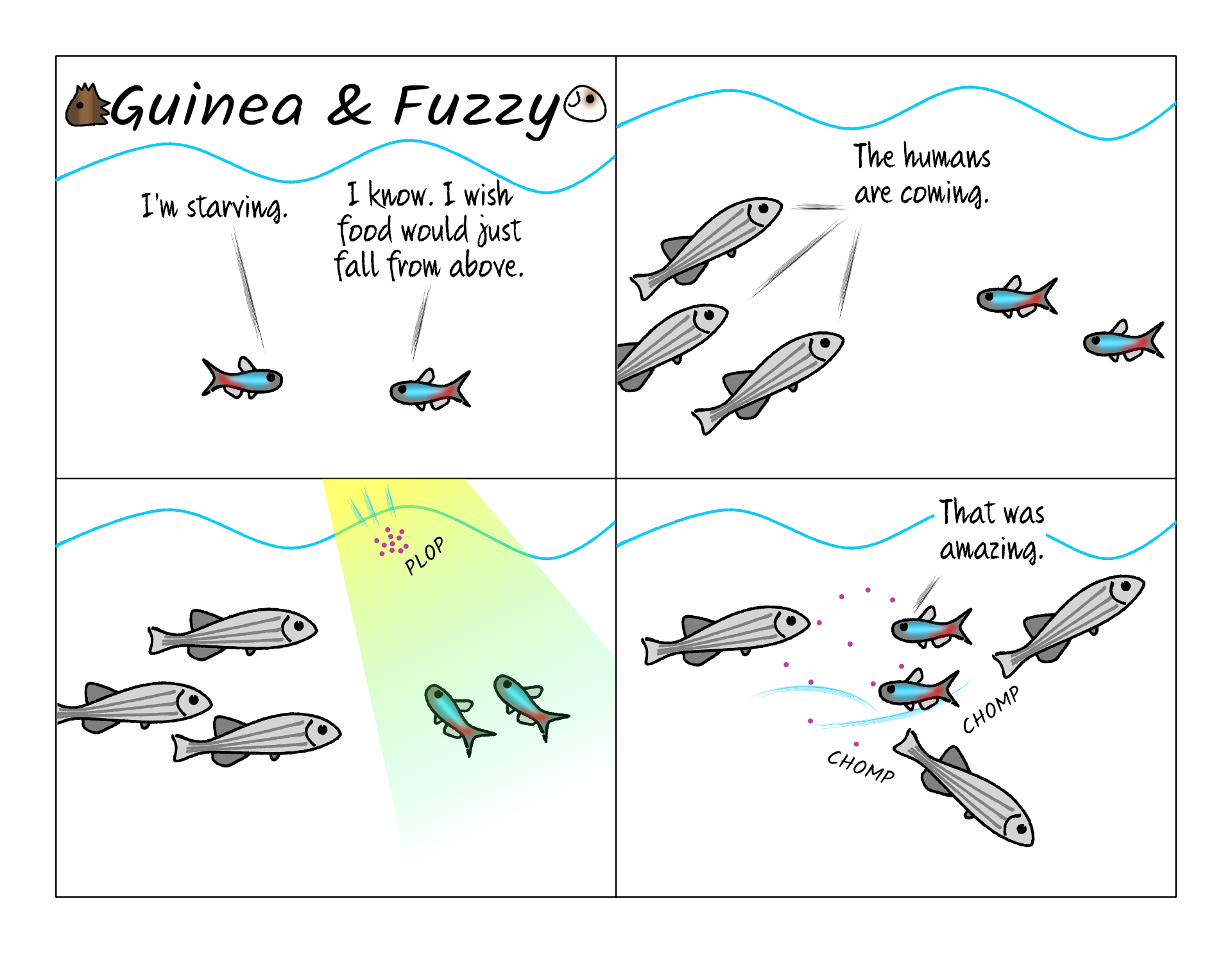 The fish recognize our faces, and when they see us walk up to the tank, they know it's time to get fed. They take their places right under the little feeding door. But when we recently got a few additional tetras, they didn't know the routine yet, but they definitely noticed the beam of light from the sky when we opened the little door.