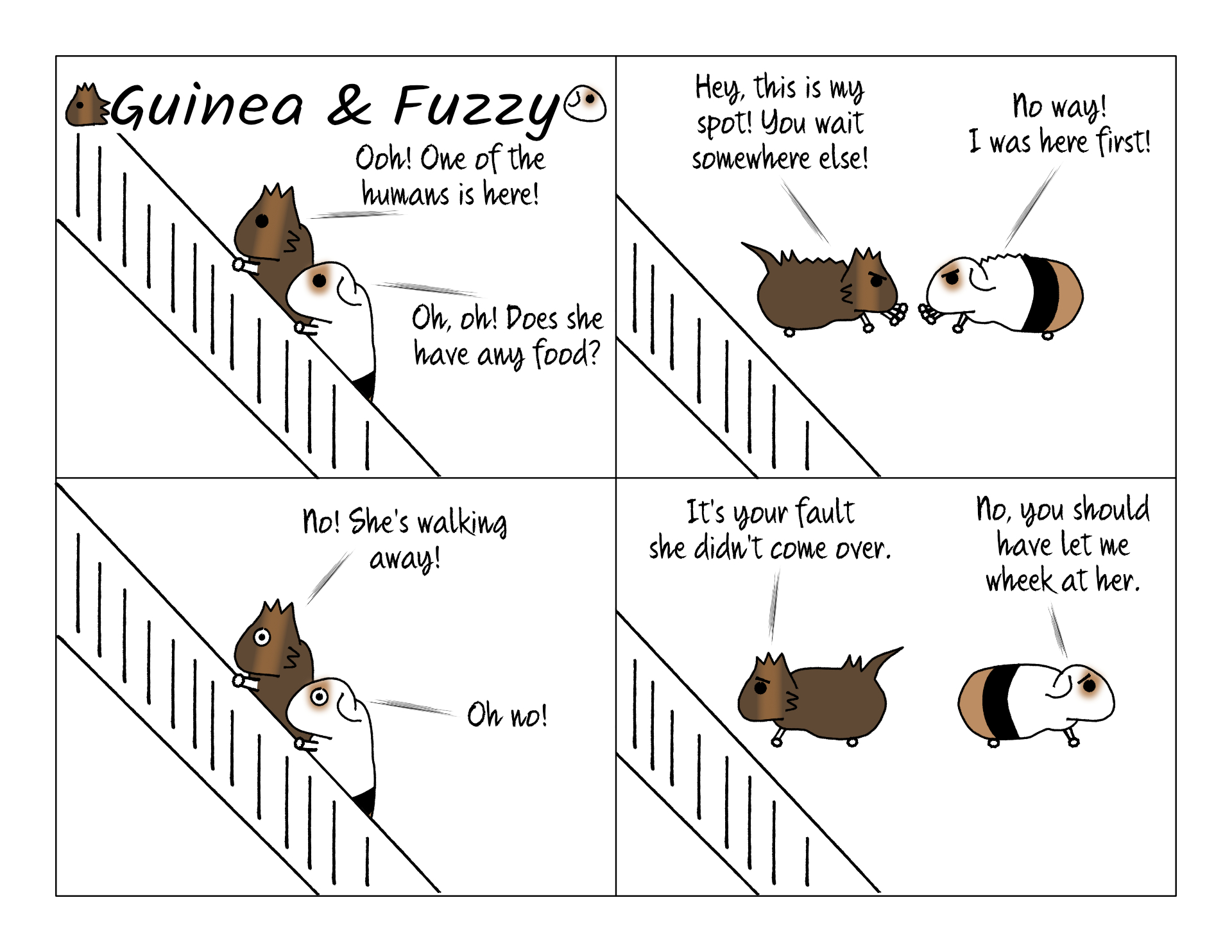 The pigs usually have their assigned spots where they sit and beg at mealtime. But sometimes when you're just walking by, they run up to get your attention. And then all seating assignments go out the window. It's a free-for-all in who can wheek the closest to the human and maybe earn a carrot.