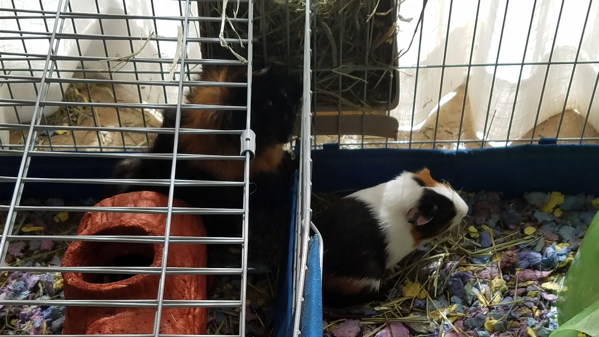 It was hard getting a photo of the two pigs together when they were first introduced, because there was so much chasing around. But here is a shot of Guinea looking in on Fuzzy during the part of the day they were separated. Keeping the pigs separate but neighbors for most of the day is a good way to introduce new buddies. You can see the massive size difference. Guinea has his cage lid over part of the cage because he had figured out how to get out, though thankfully we didn't have to use it long before he decided he actually had no interest in leaving the cage when we weren't around.