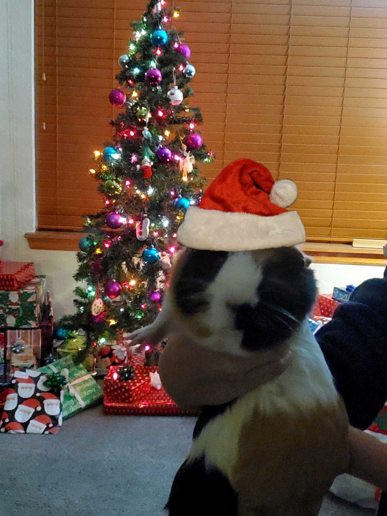 Fuzzy wishes everyone a Merry Christmas! Obviously we didn't actually put a Christmas hat on him. He loves us, so he might actually let us put one on these days, but we know he doesn't like it. So this "seamless" photoshop will do the job.