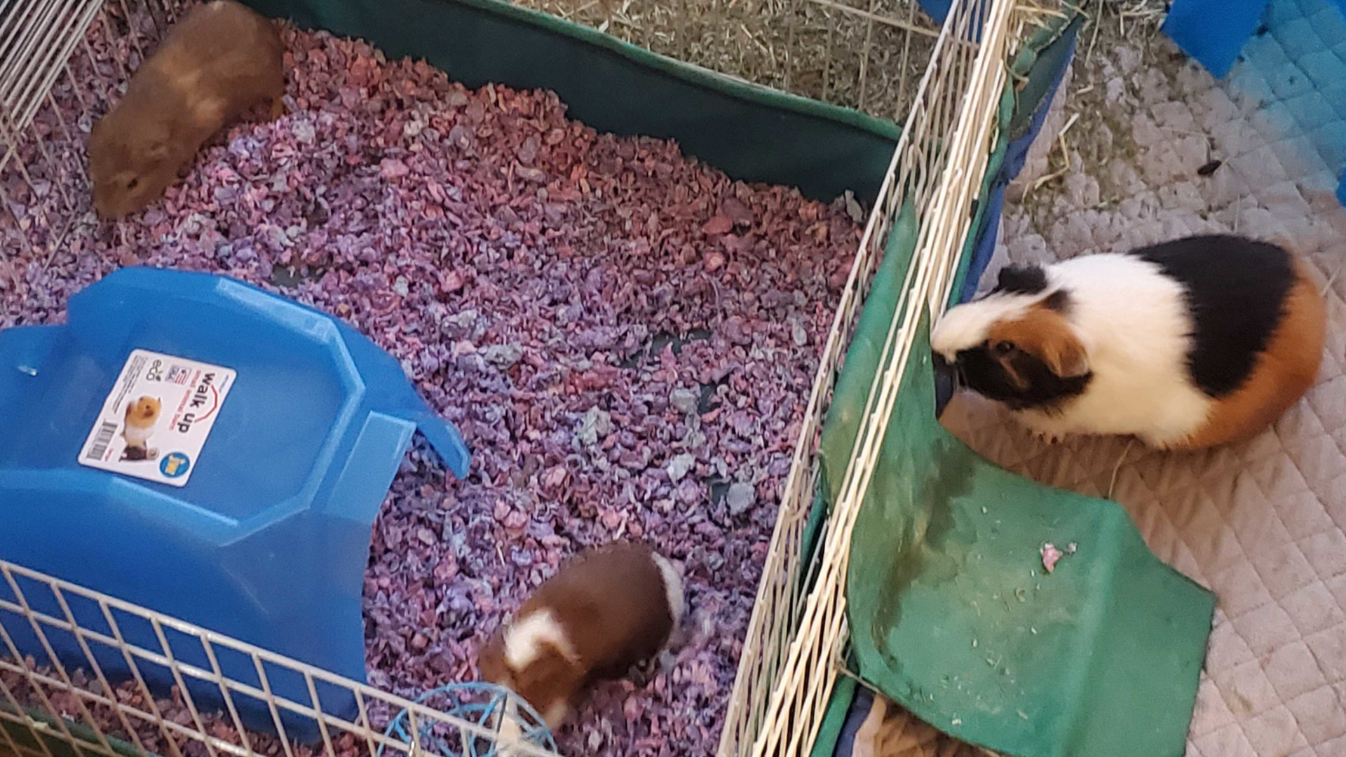 They are currently being quarantined, just for safety, in the second half of the cage, with Fuzzy in the other half. Don't worry, the little square in the photo is only half of their space, but we lifted the ramp for the photo because they were hiding under it. In fact, we had to remove the center wall with the ramp entirely after this, because it was too big and steep for such tiny, little pigs!