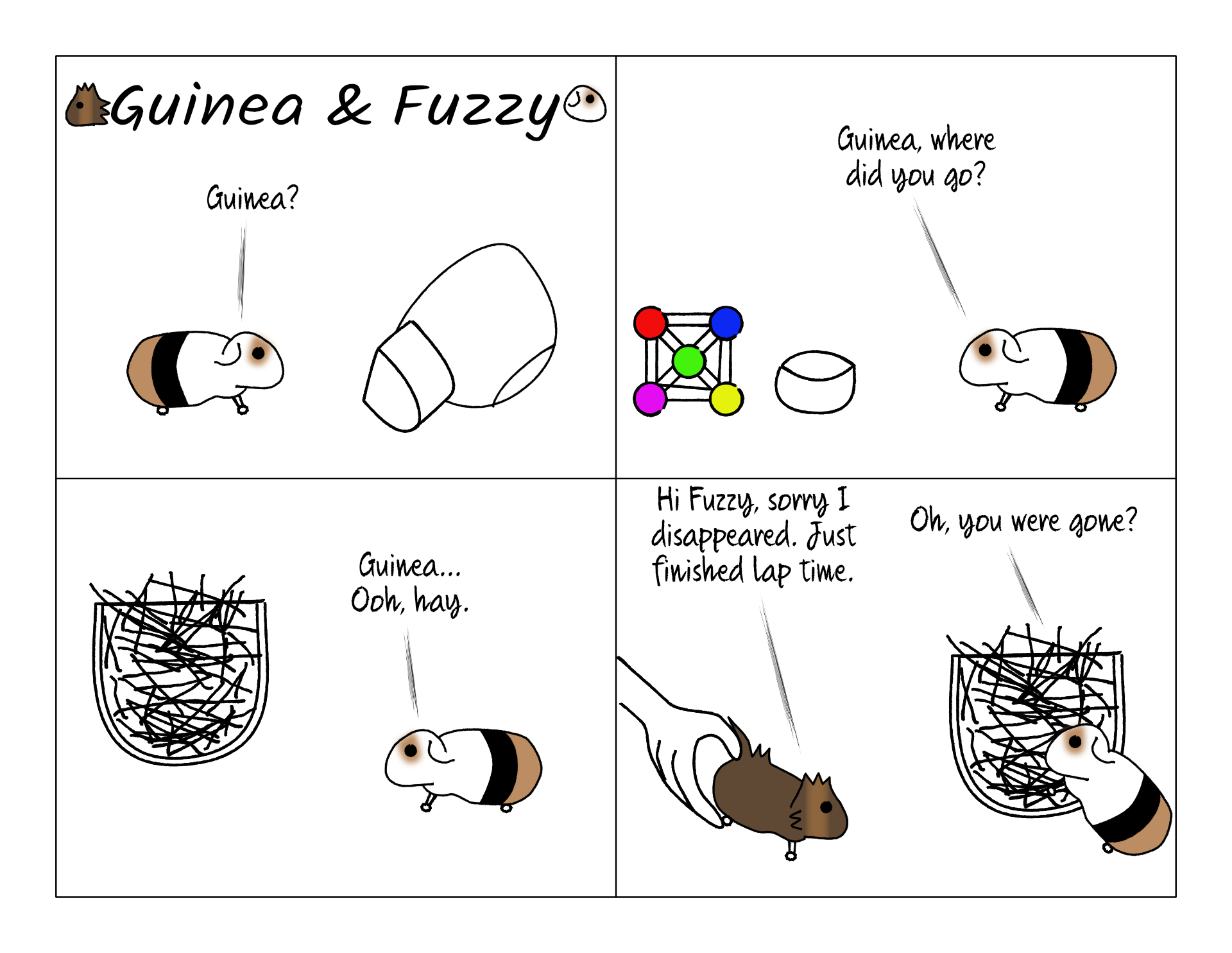 Usually when one pig is getting lap time, the other just sleeps right through it. One time, though, Fuzzy just happened to walk over looking for Guinea right after we picked him up. When he didn't see him on the other side of the cage, he panicked! He started running around checking all the pigloos and corners...