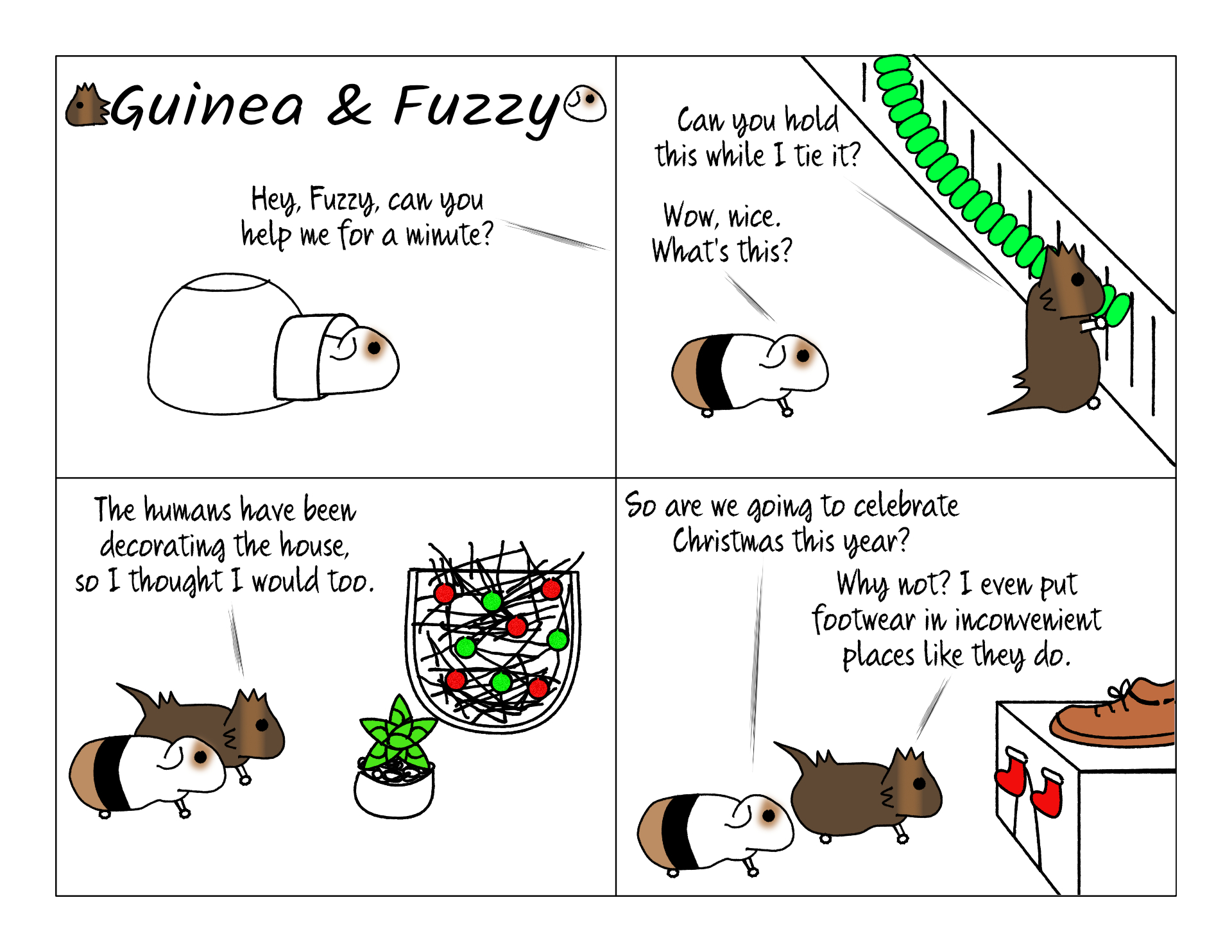 Hopefully the pigs do feel the holiday cheer, since they get to stay right by the tree all during Christmas season. Their whole room smells like pine while the tree is up. Pine isn't good for the pigs to eat or sleep in, but they probably enjoy smelling an actual tree for a change.