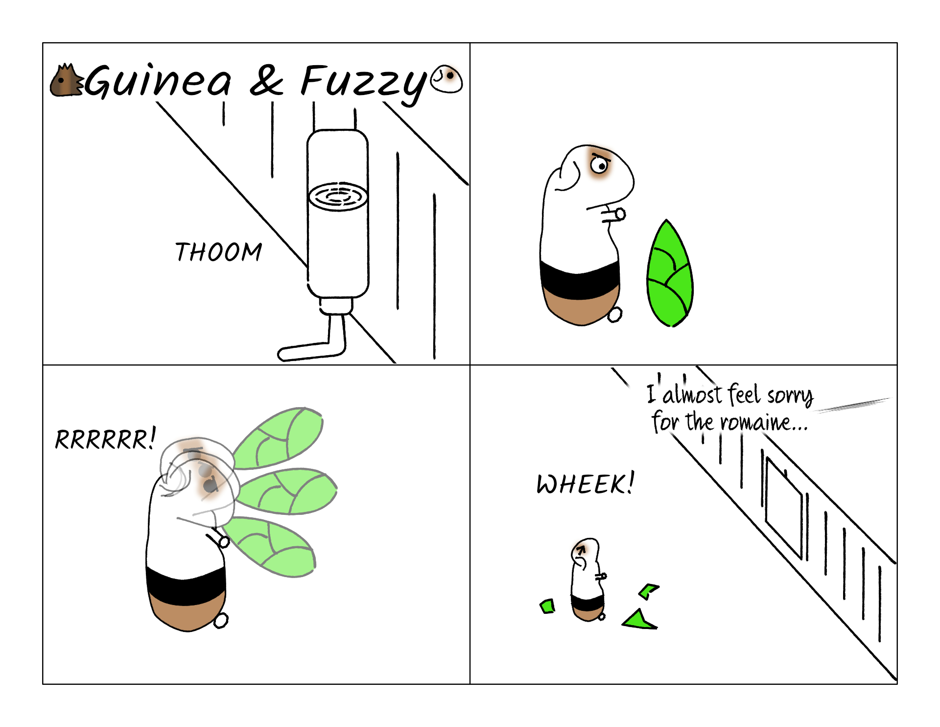 I guess this is technically the second comic inspired by Jurassic Park. I saw Fuzzy swinging his veggie back and forth like a T-Rex and couldn't resist. Tempted to have a banner floating down that says "When Guinea Pigs Ruled the Earth."