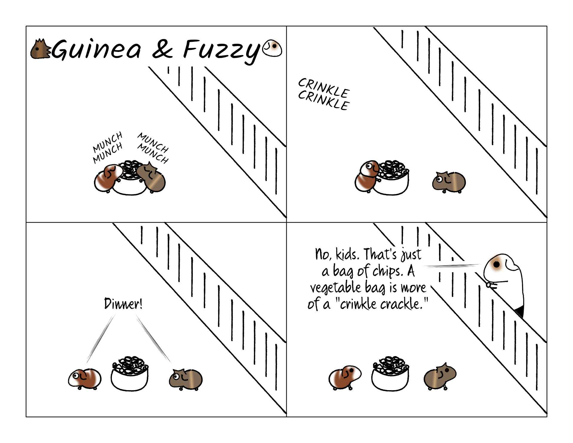 I noticed this was going on not long after we got the babies. I would open a bag of snacks or be taking out the trash and the babies would start wheeking. Meanwhile Fuzzy would be snoozing away in his half of the cage.
