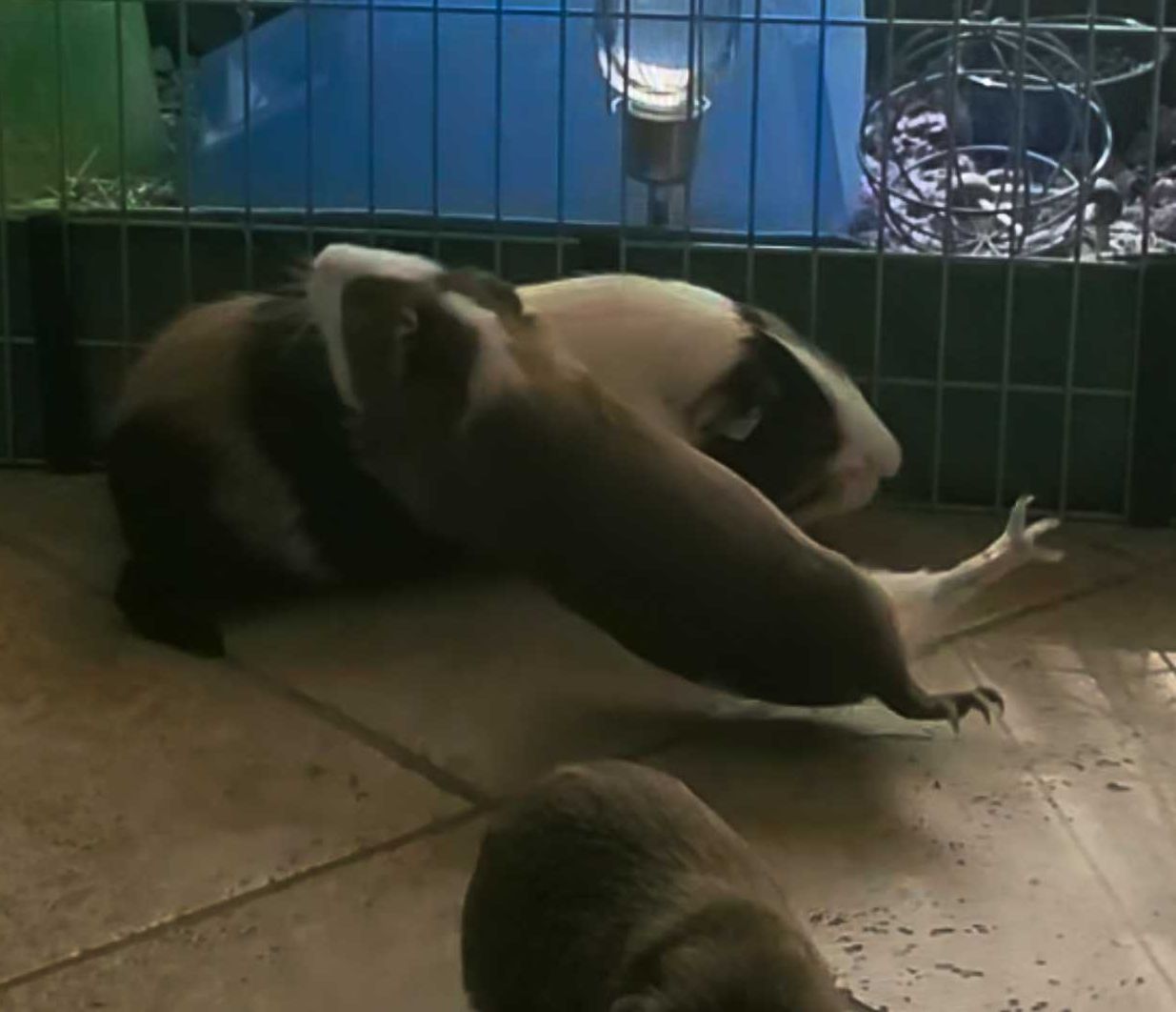 When we first introduced the pigs to each other, we did it outside of the cage. We put all three of them on the open floor. At first, they didn't seem to notice that there was no longer a barrier between them. They just carried on doing their own floor time things.