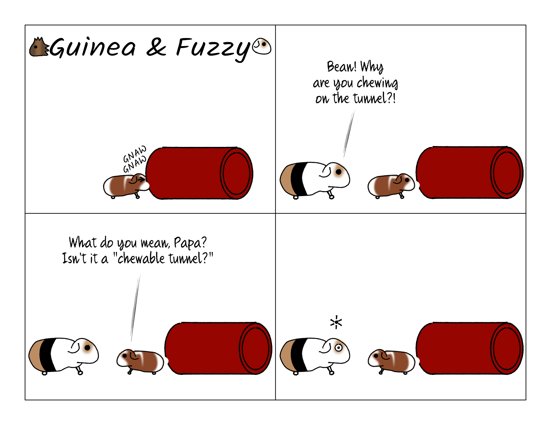 It is a chewable tunnel. I've mentioned in previous comics, it's the Ecotrition Snak Shak, with a suspicious lack of the letter C. Guinea and Fuzzy were never interested in actually chewing it, but Potato and Bean have actually tried it out. Chewing on hard objects like that is actually good for their teeth. They grow continuously, and if they don't have anything hard to chew on, they can grow so long they cause pain and other issues. None of the four pigs ever had any dental problems, though.