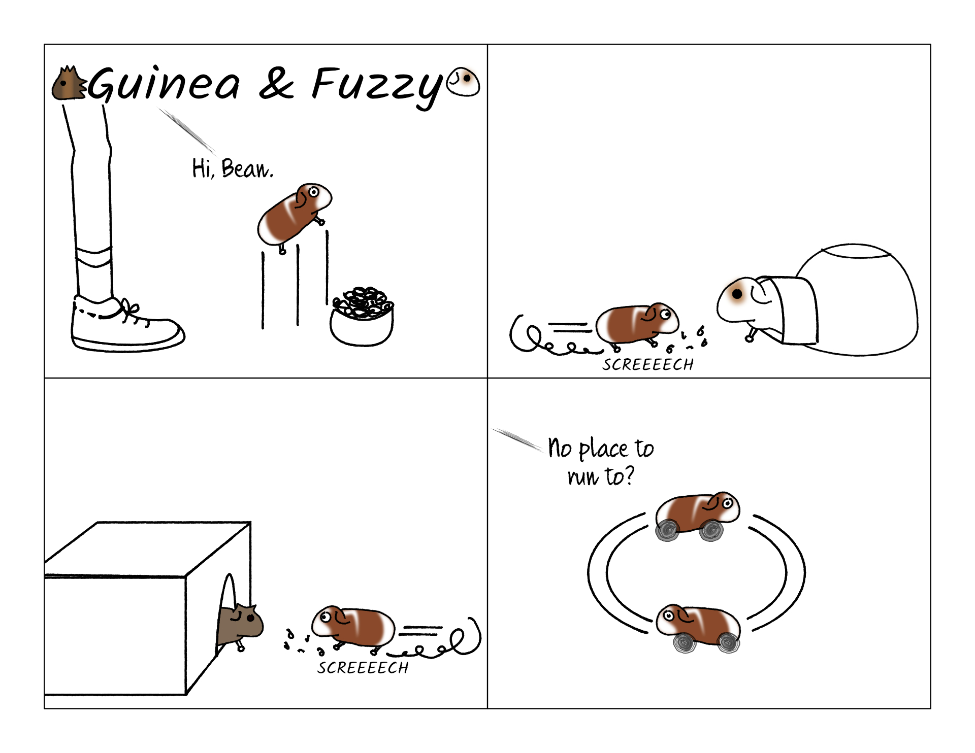 Bean always has to find a pigloo to sprint for when we come up to the cage. Usually if the nearby pigloos are occupied, it doesn't matter, and he'll squeeze past whoever's there. But a few times the other pigs were blocking the entrance so well he wasn't able to get in. Which leaves him just running around madly.