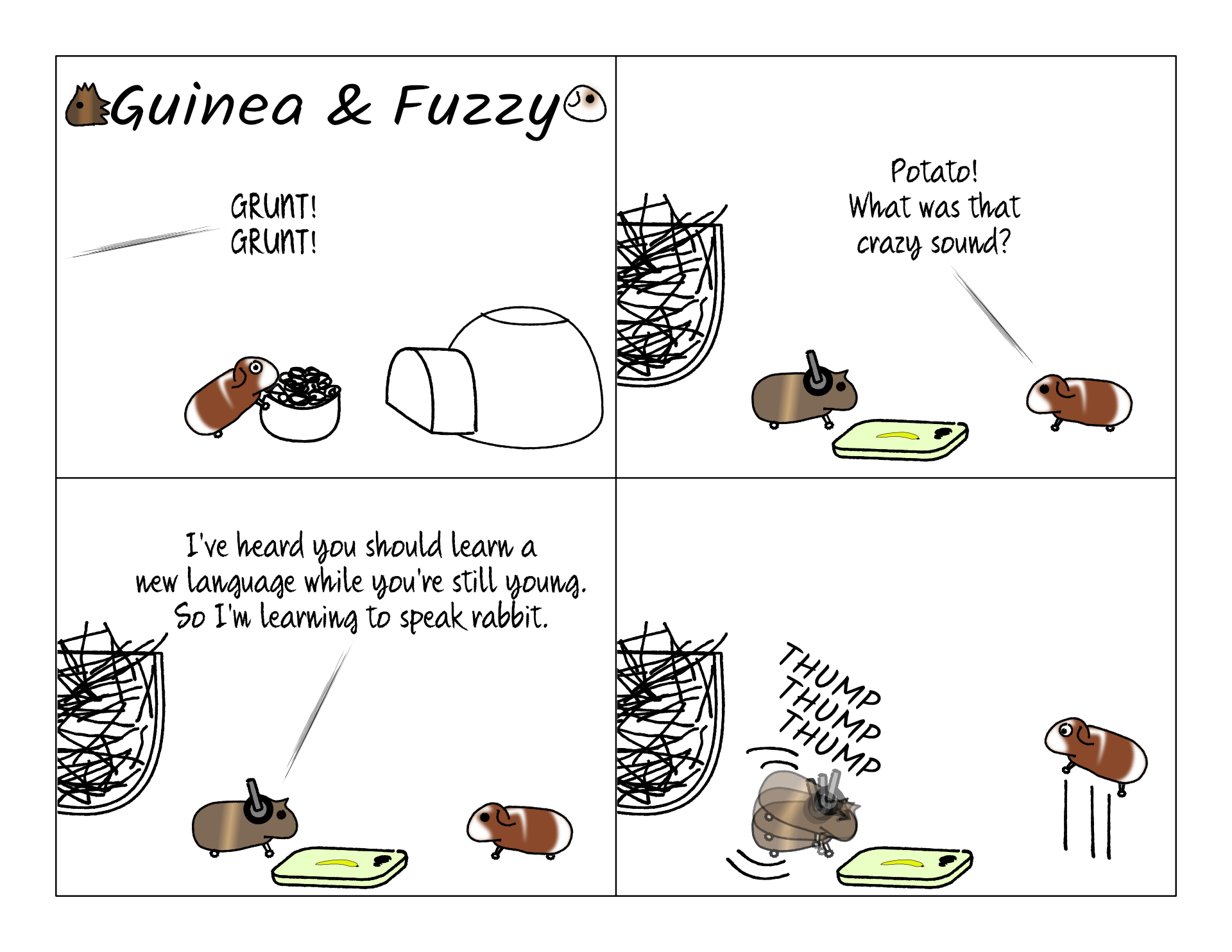 We've never had a rabbit, but I did research to find out if they make similar sounds to guinea pigs. It turns out they do not. Guinea pigs "wheek" most often, which is a high pitched call. They can also make a purring sound which can either be happiness or anger depending on how it's delivered, and they chatter their teeth when they're really angry. Everything else is a variation on those three. Rabbits apparently make a lot of grunting and snorting noises. And although they can make a sort of high pitched squeal, it's not regular communication and it doesn't really sound like a wheek.