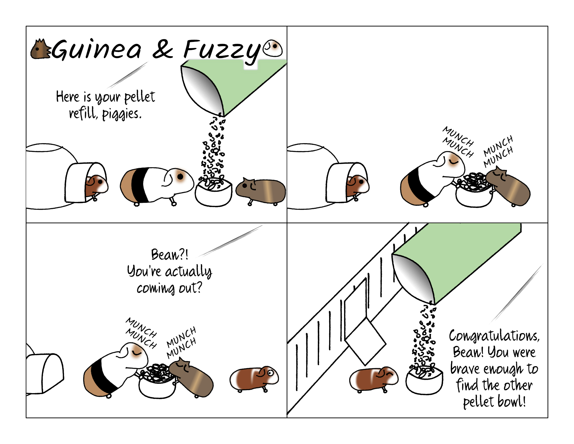 As Coco Bean gets a little older he gets a little braver as well. He doesn't always stay hidden the whole time we're at the cage now. Sometimes he'll pass cautiously from one hiding spot to another. Without even running! At least one time this allowed him to discover that I was filling the second pellet bowl while Fuzzy and Potato were busy fighting over the first. So he had pick of the pellets.
