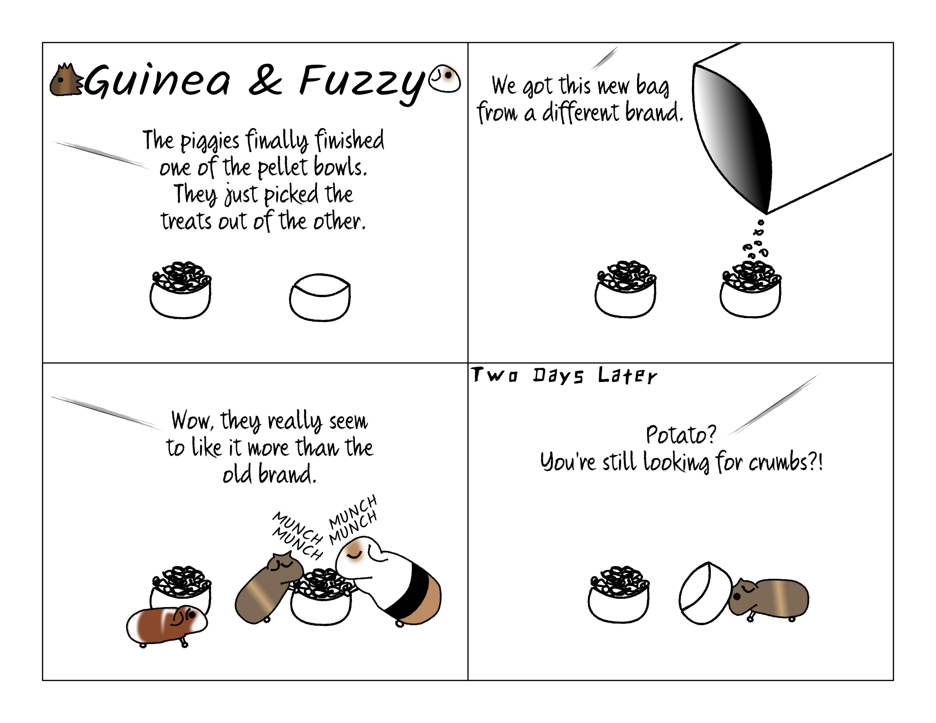 Not to name names, but there's a certain pellet brand named after a cataclysmic solar even that includes a ton of treats and snacks. Pea flakes, dried carrots, corn, bananas, papaya, pineapple, etc. Yes, I know they're not supposed to eat corn, they kind of just snuck that in there. The pigs really love all those treats, especially the pea flakes. But the pellets themselves are made from alfalfa hay instead of timothy hay. They hate that stuff. When it was the only choice, they would eat a little. But as soon as we could replace it with the plain, regular timothy hay pellets, they wouldn't touch the other stuff.