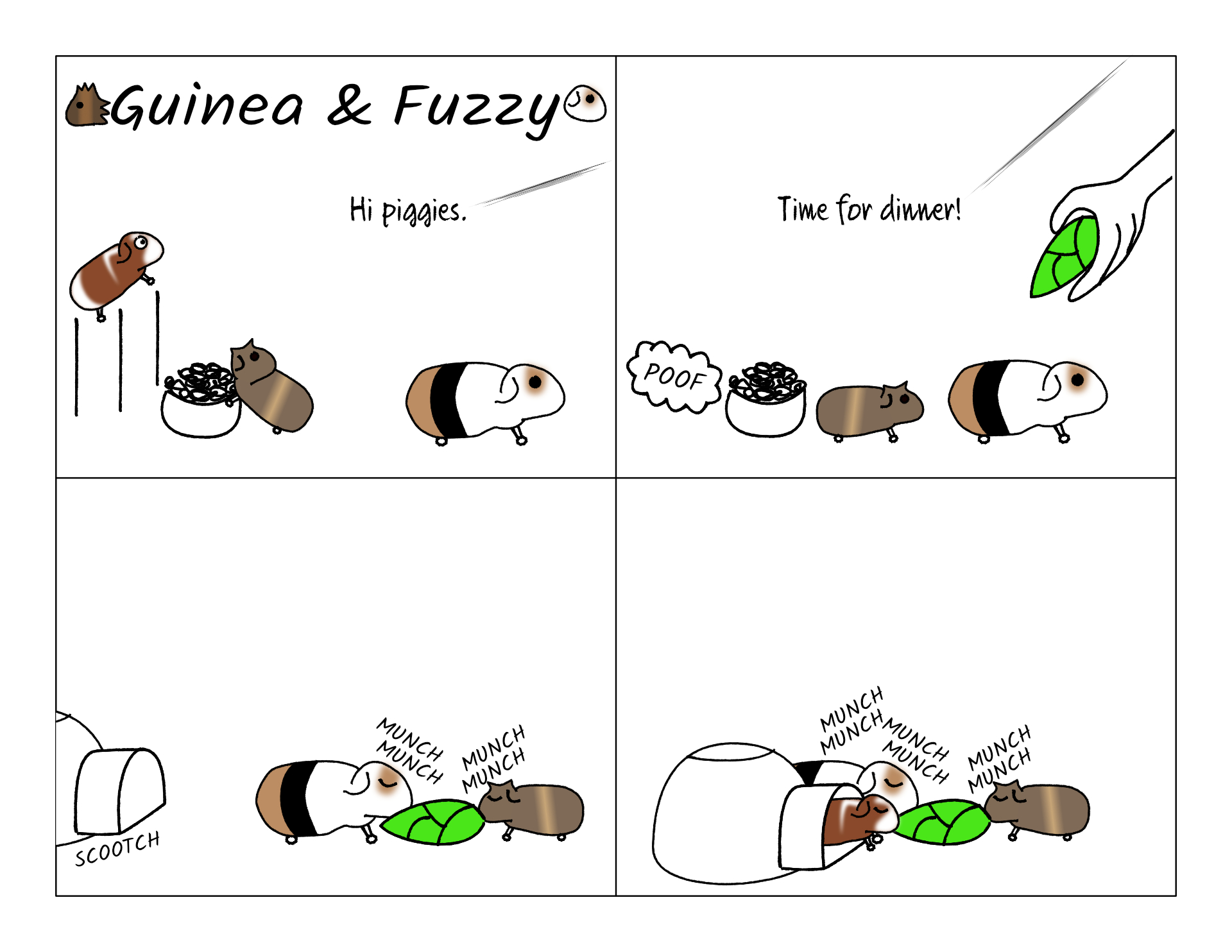 During Bean's transition period between completely hiding during feeding time and actually being brave enough to take food from us, he figured out a novel solution. He would run for his pigloo, but then he'd pick it up and scootch it over to the food. That way he could eat from the big pile and stay in cover at the same time.