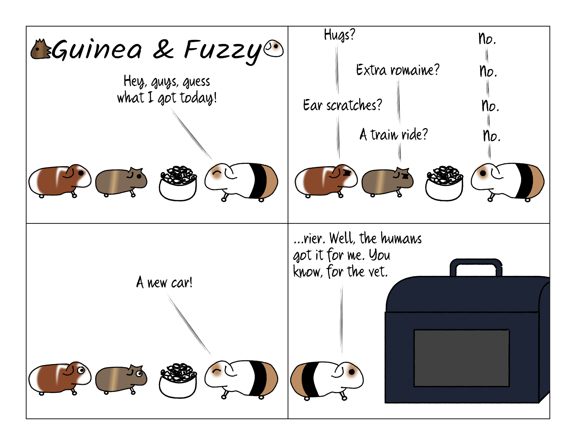 We finally bought a new pet carrier! Fuzzy was going back to the vet for a follow up, and we didn't want her to remind us for the fifth time that our normal, guinea-pig-sized carrier is way too small for him to fit in comfortably. He can fit in it, but not move. So we got him a full size dog carrier. The nice thing is, it's big enough that he's comfy, and we could squeeze all three pigs in, (or two, plus Potato in the old carrier) if we needed to for some reason.
