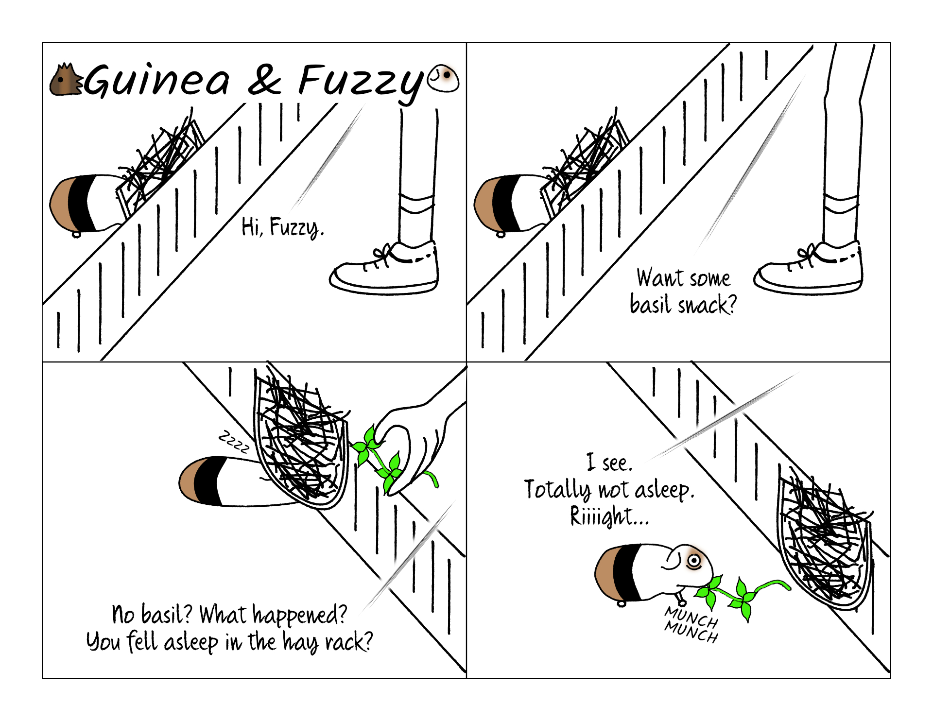 Fuzzy has fallen asleep while eating once or twice with his face in the hay. It might seem totally natural. After all, people sleep on hay all the time, hence the expression.