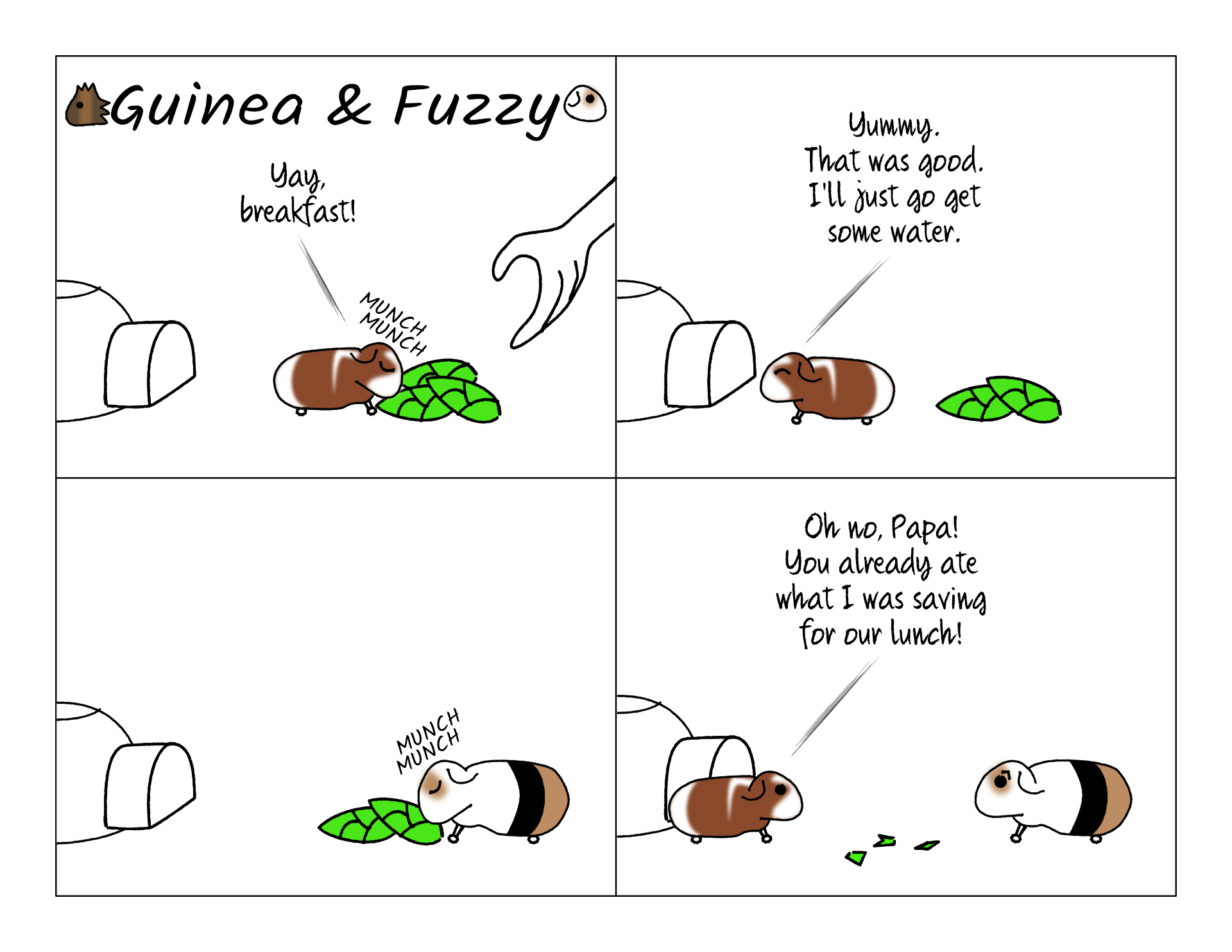 Neither of the other two pigs can eat as fast, or for as long, as Fuzzy. Potato has a tendency to take little nibbles and put his food down while he chews, which gives Fuzzy the chance to snatch it out from under him. Bean, on the other hand, seems to eat his fill and then try to save some for later. Which sometimes works, because he's always hidden off in some corner, but usually Fuzzy finds it eventually.