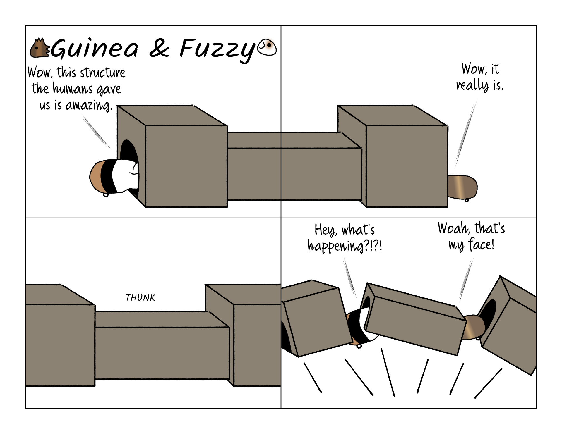 We get our bedding from GuineaDad.com. When you order stuff from them they come in edible boxes that can be assembled together into tunnels and houses. They call them "crunchy condos." Since we got a variety of products this time, we had enough to assemble a whole structure.