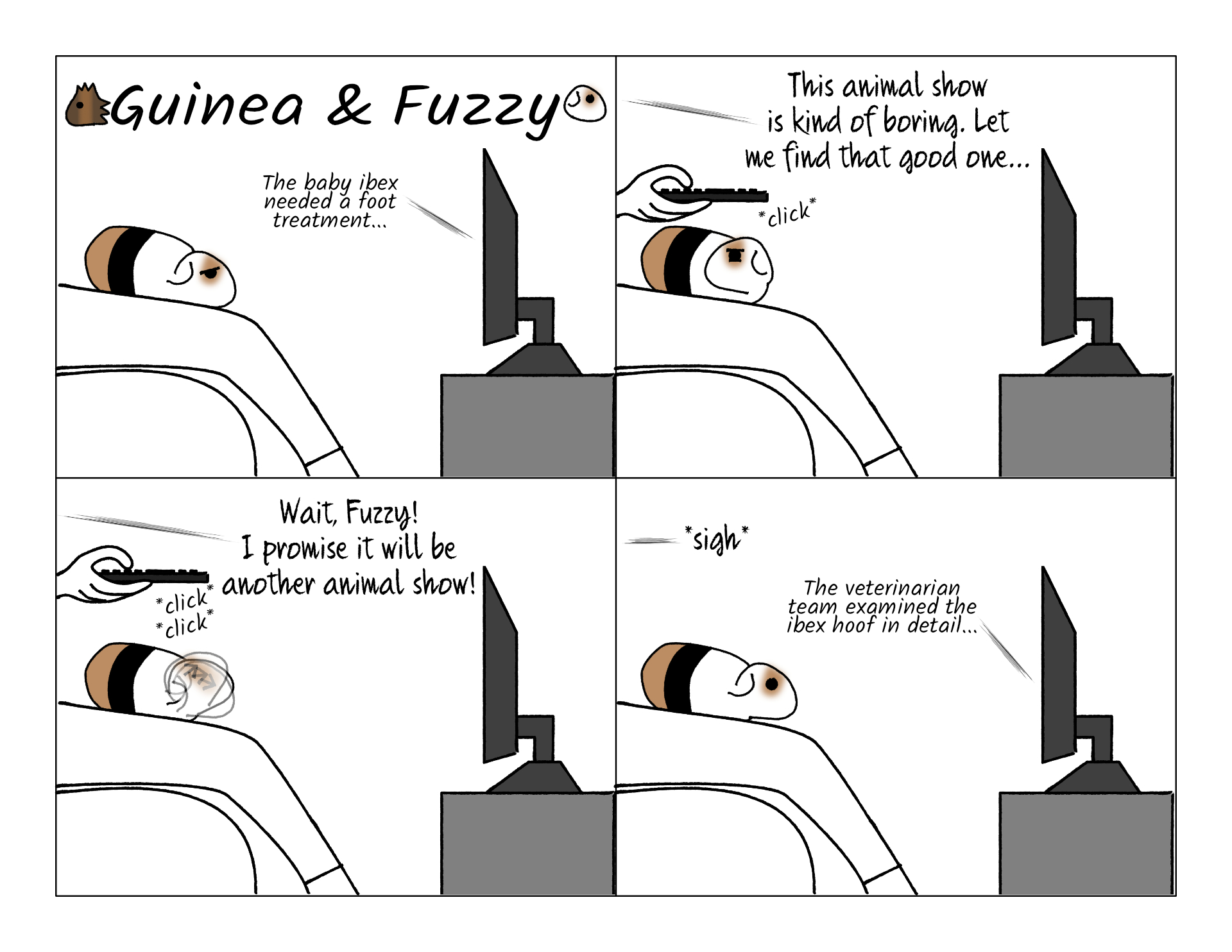 I'm not making it up. Fuzzy really is picky about what he watches. I think I mentioned before he loves animal shows? We knew this so we sat down to watch TV with him, and picked a random one. It was not one of the better ones. I decided to switch to something I already knew was better. But as soon as I stopped the show and started browsing, Fuzzy started struggling and complaining!