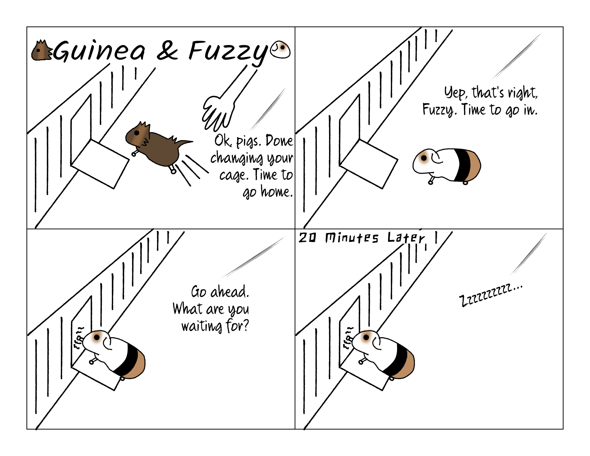 Daughter of comic #2 January 26, 2021 - 11:37amActually fuzzy stands at the door when it is time to come out.He always teeth chatters at me when I give Guinea the food because Guinea is already outside of the cage. |