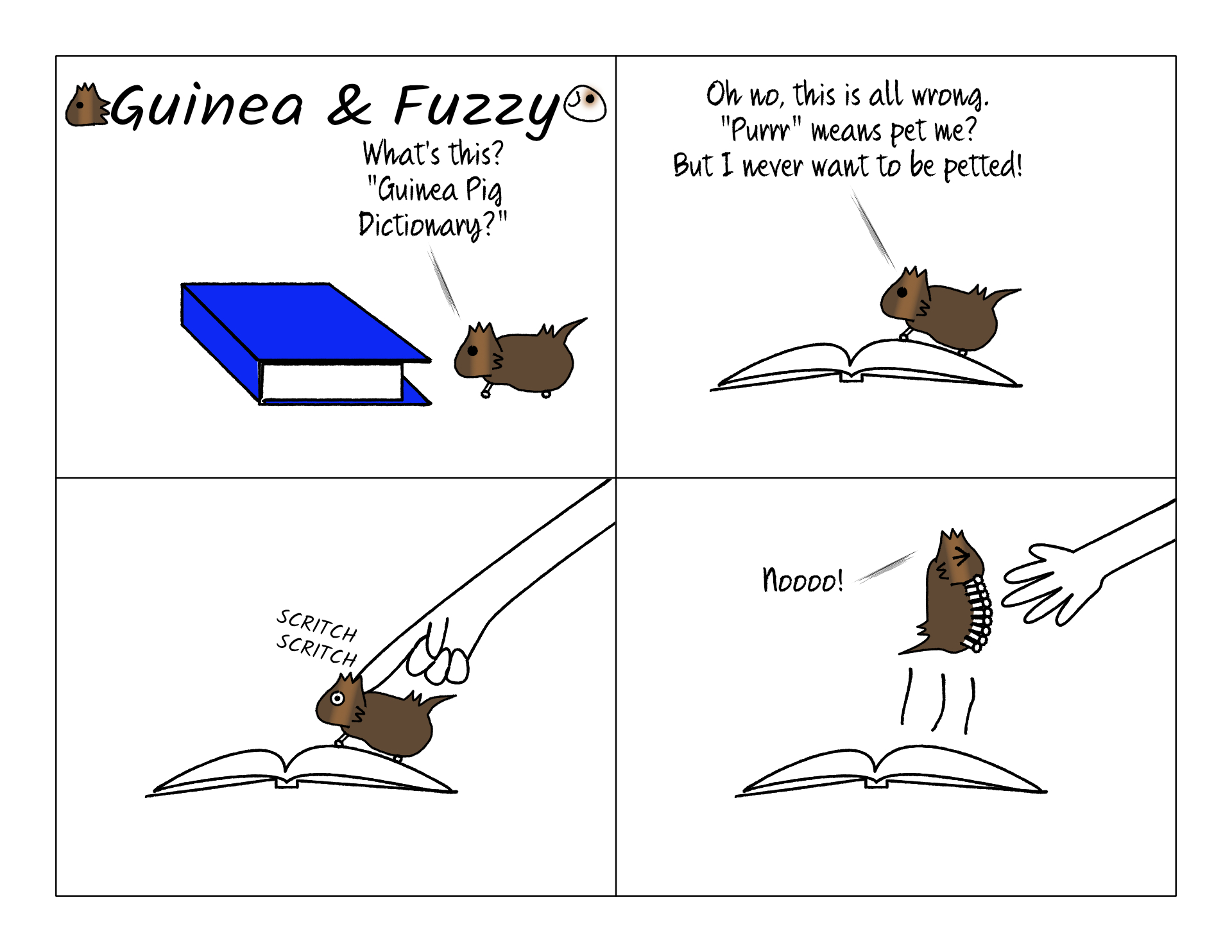 This illustrates the point. A guinea pig purring is actually part of rumble strutting. It's a warning and a sign that it doesn't like what's happening. Sometimes they will do that if they're afraid you're about to pet them and they don't want it.