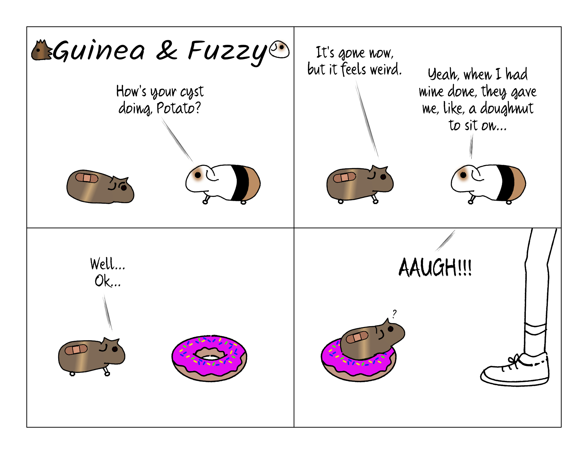 When Fuzzy had his cyst removed, they slathered it in honey (an animal-safe disinfectant), gave us some silver cream to apply for a couple of weeks, and also suggested he sit on a heat pad for a few days. For Potato, they just sent him home and didn't recommend any extra care. I guess Potato's removal didn't go as deep. The opening was wider, though, so it took a very long time to close up.