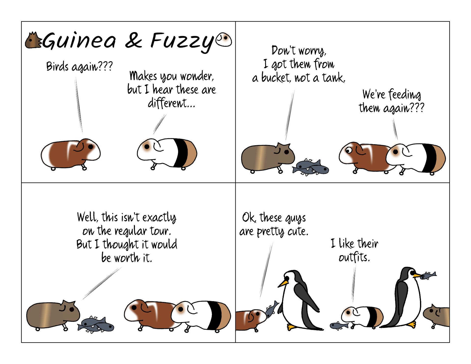 Penguins seem like just the kind of animal our piggies would want to hang out with. They're cute, non-aggressive, and pretty chill. No pun intended. Unfortunately the pigs couldn't go swimming with them. They used to have penguin feeding available at our aquarium, but they haven't reopened it since 2020.