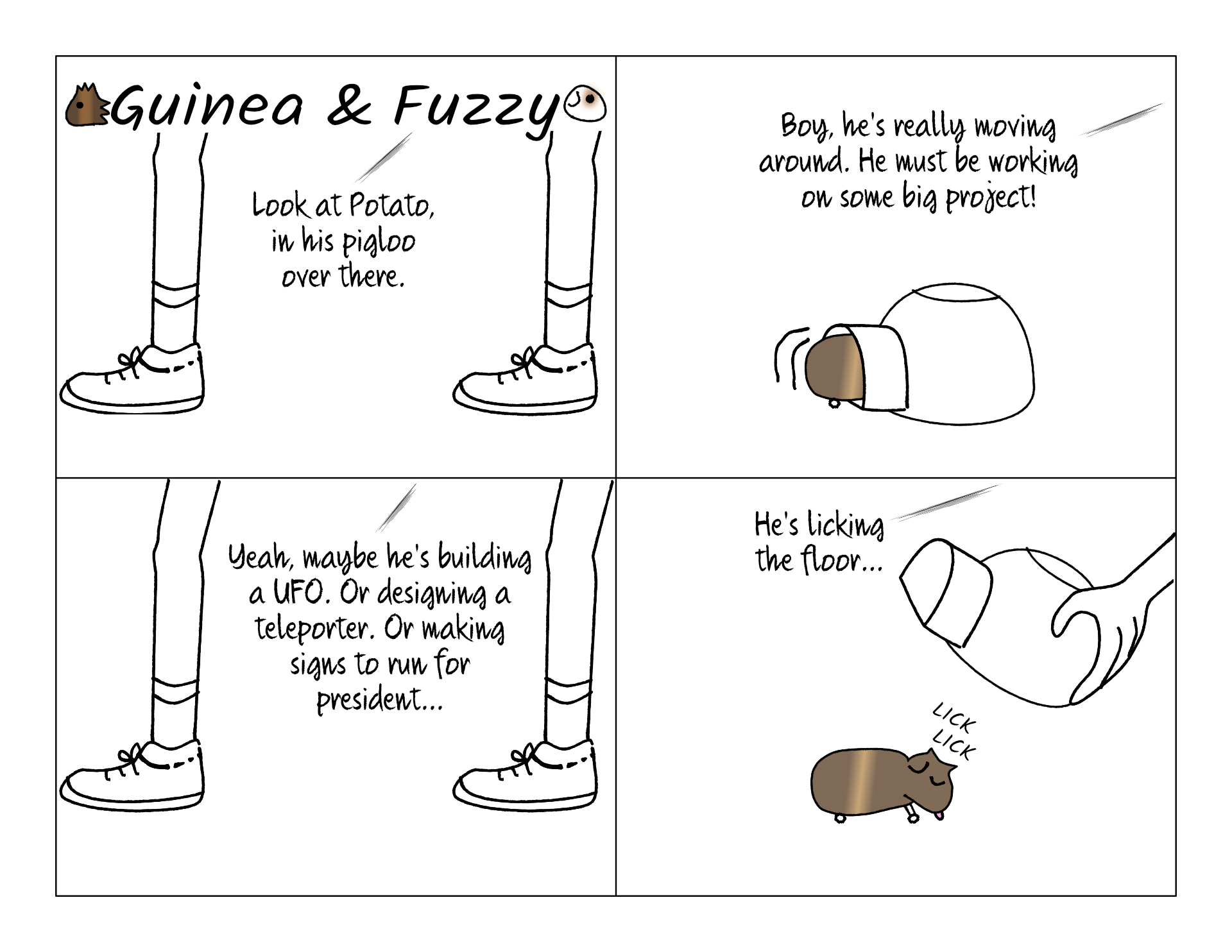 Potato is the only pig we've seen licking the floor. In fact, the other two rarely lick anything. I think it's because he's the only one who's noticed Fuzzy leaves crumbs behind when he eats his tummy treat. That doesn't explain why he would do it inside a pigloo, necessarily...