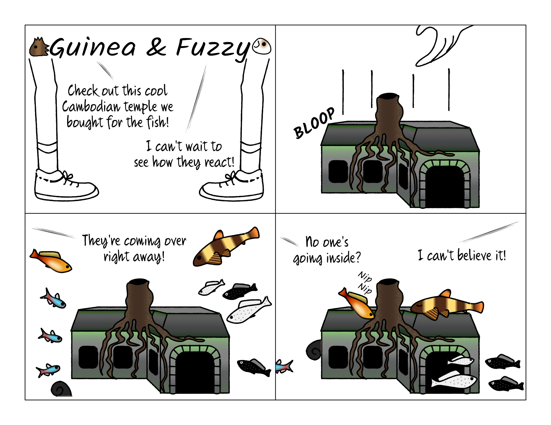 This was a really cool tank decoration we got. Often mistaken for Ankor Wat, this is actually Ta Prohm, a different temple in the vicinity of Ankor Wat near Siem Reap, Cambodia. It's the one you always see in the movies. We were excited to see the fish reactions. They checked it out right away... Then drifted away disinterested.